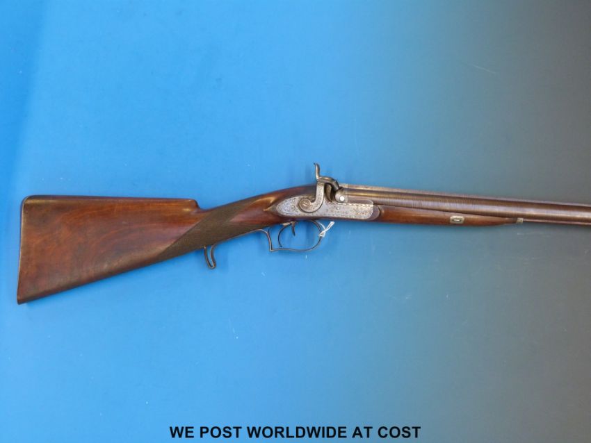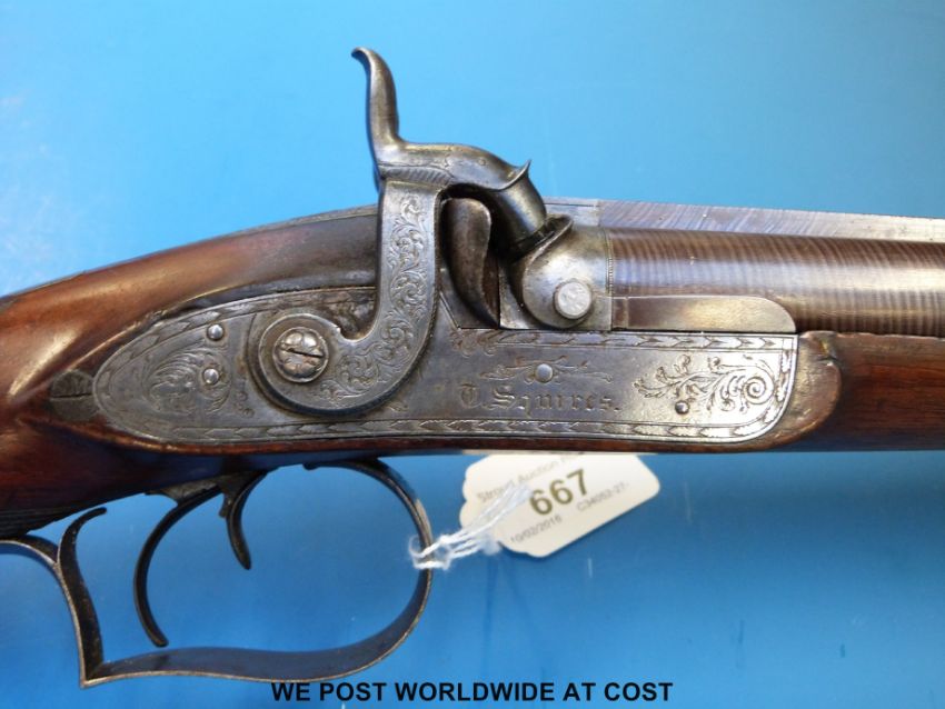 Squires side by side hammer action muzzle loading gun with ornate engraving to the locks and dolphin hammers, fine engraved scene of a dog and a bird to the trigger guard, engraved and inlaid finials to the underside and forend, chequered grip and well pattered 27.5" Damascus barrels. Overall length 110cm