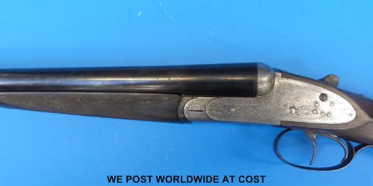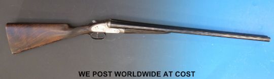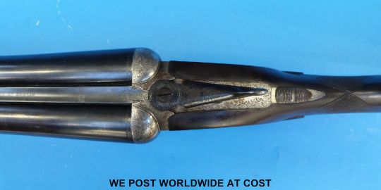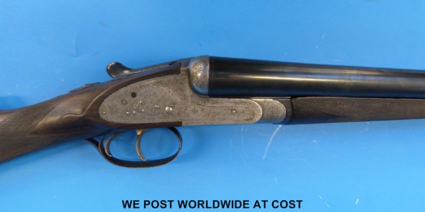 Trulock Brothers 12 bore side by side shotgun with all over ornate engraving of partridge and snipe to the side locks and a spaniel to the underside, chequered grip and forend, rosewood teardrop stock with vacant inlaid gold cartouche, double triggers and 26" barrels named to the rib Trulock Bros, 13 Parliament St, Dublin. Overall length 118 cm, serial number 16636. PLEASE NOTE THAT A VALID RELEVANT FIREARMS/SHOTGUN CERTIFICATE IS REQUIRED TO HANDLE/PURCHASE THIS ITEM.