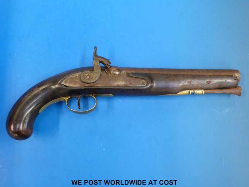 A percussion holster pistol with brass mounts, trigger guard and steel ramrod, stamped indistinctly to the lock and 54 to the top plate. C1840, overall length 38cm