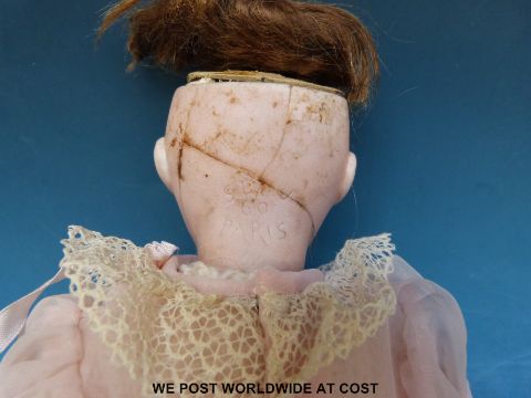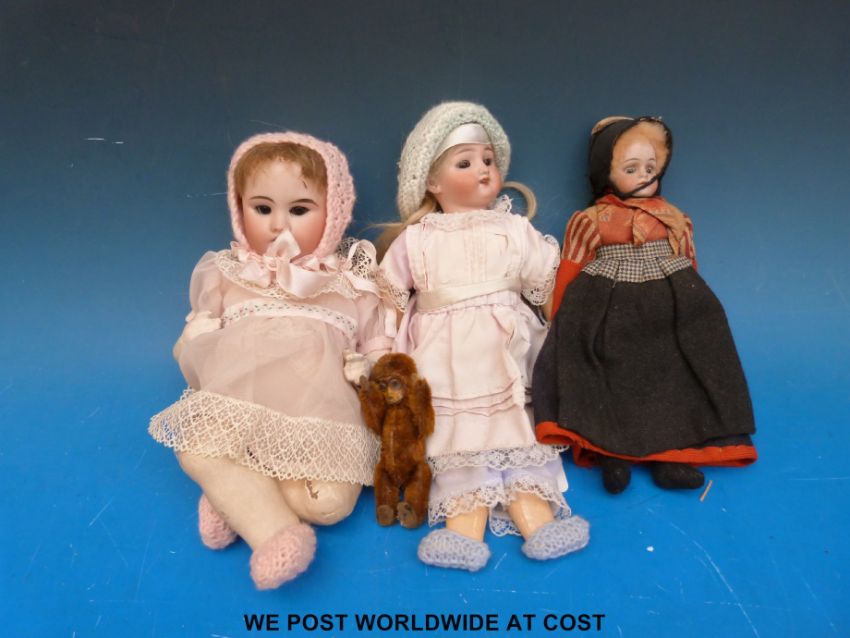 Three dolls, two with open mouths, teeth and opening and closing eyes (1 x German, 1 x French) another doll in national costume with closing eyes and a small monkey