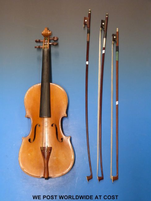 A cased "Skylark" 4/4 violin with 36cm back, together with three bows