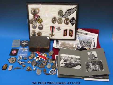 A quantity of mainly Nazi German militaria including flag, badges including pre-war examples, photographs of Hitler etc., some replica items