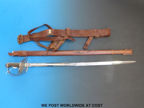 An 1895 pattern sword with replacement blade, in leather scabbard.