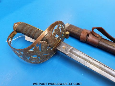 An 1857 pattern Royal Engineer officer's sword in leather scabbard, possibly by Pillin, blade No. 97415?, replacement scabbard