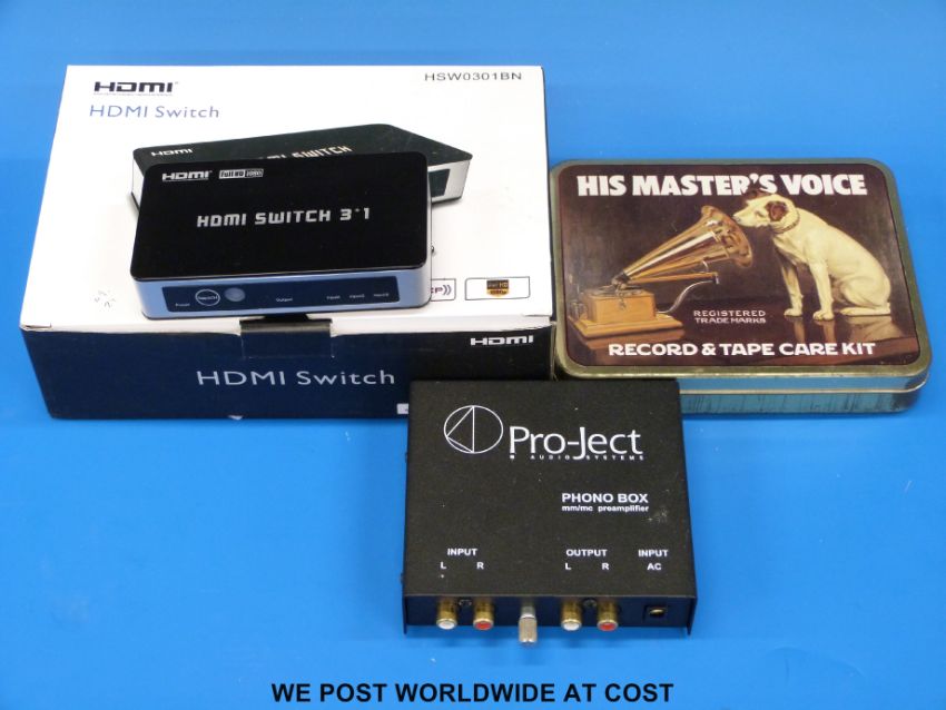 Pro-Ject phono box together with an HDMI 3D switch and His Master's Voice tin with cassette tape-cleaning equipment.