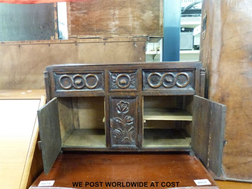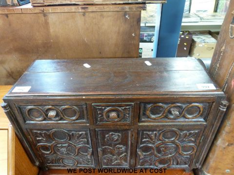 An oak carved miniature or apprentice chest/ sideboard with columns to corners, three drawers with three cupboards below