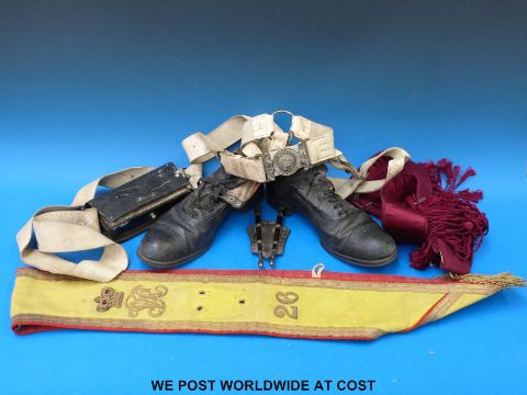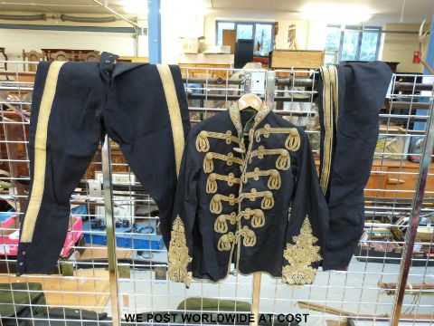 A quantity of Victorian Kent Artillery Volunteers uniform to include belt with buckle, sash, jacket with gold thread embroidery, drummer's insignia etc. According to the vendor this uniform was owned by Robert Hale.