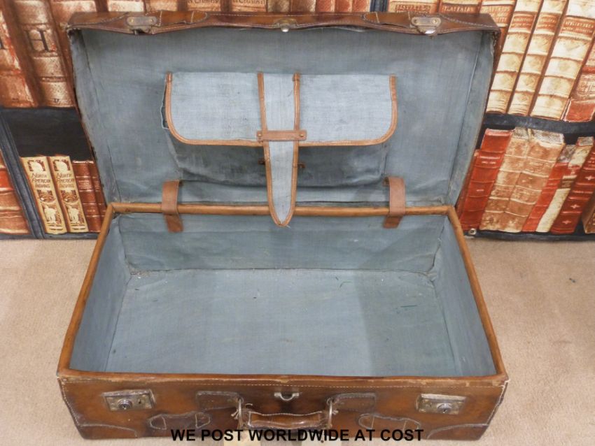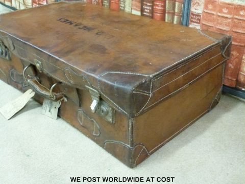 A vintage brown leather suitcase with tickets and shipping labels.
