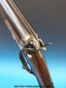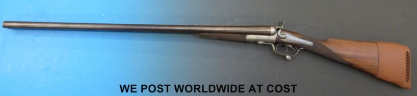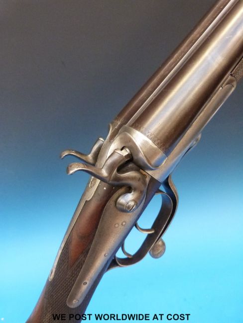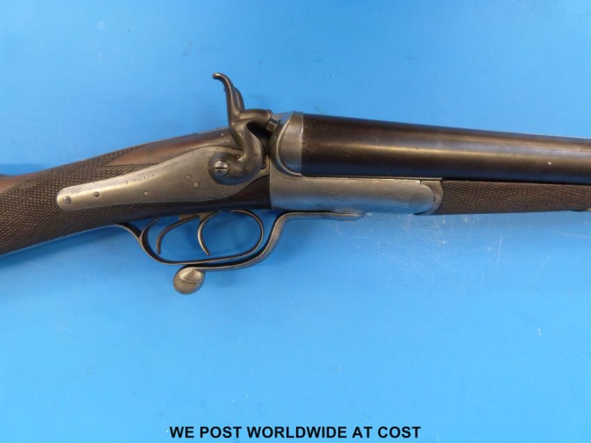 T Miller 10-bore side-by-side hammer action shotgun with line engraving to the locks, hammers and rotary under-lever, chequered grip and 32" replacement barrels named to the rib Rowland Watson, Whittall Street, Birmingham, serial number 19462. Overall length 124cm, serial number 11125