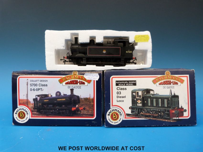 Three Bachmann 00 gauge tank locomotives Class 03 diesel 31-351, Collett 5700 Class 0-6-0 PT 31-901A and 0-6-0 47310, two in original boxes
