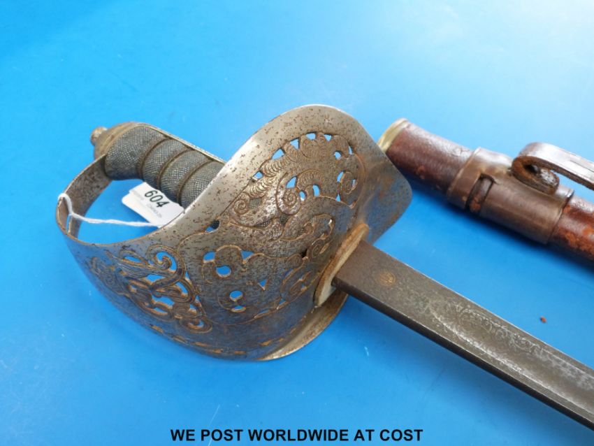An 1897 pattern sword in leather scabbard, possibly by Mole. Impressed no: 4723 to blade.