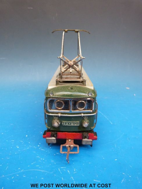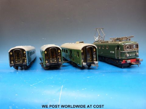 A 1950's 0 gauge JEP SNCF BB-8101 diesel locomotive together with 4761 wagon baggage luxe car, 4761 wagon restaurant luxe car and 4761 wagon Pullman luxe car all in original boxes with transformer and track