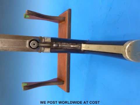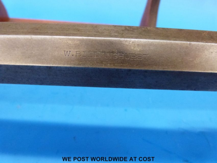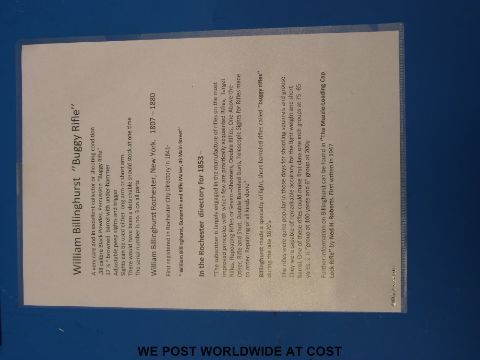 William Billinghurst, Rochester, New York .38 calibre under-hammer percussion buggy rifle with 17.5" part octagonal barrel named to the top W Billinghurst, adjustable sights and white metal and rosewood grip. Serial number 3 on all parts, overall length 58cm, on wooden stand
