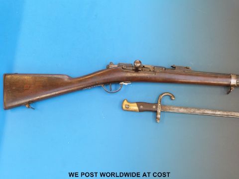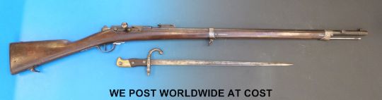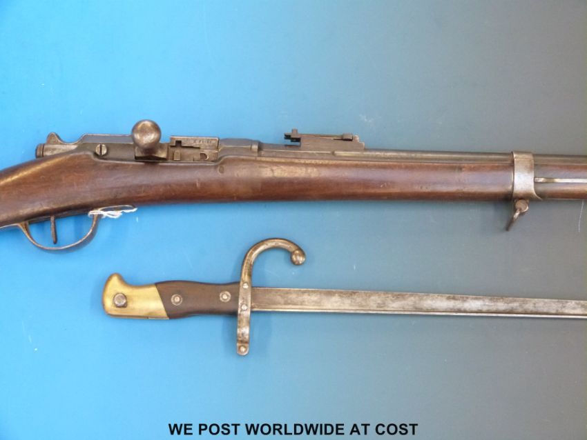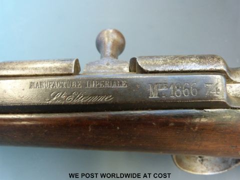 French 1866-74 24 bore bolt action gun bored out from a rifle, stamped to barrel and action Manufacture Imperiale St Etienne MLE 1866-74 H41635 S18685 MI and to stock N.S H33702, with bayonet engraved Mre d'armes de st Etienne 8 fre 1878. Overall length 190cm