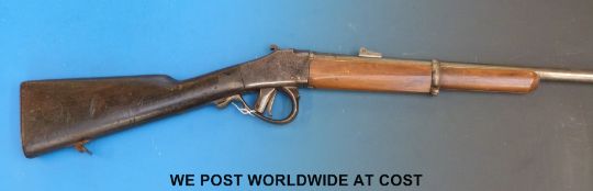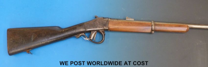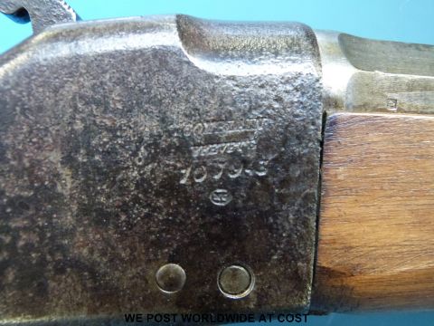 Columbian 11mm breech loading carbine rifle stamped to the stock Syndicat Liegeois Armes De Guerre. With 22" barrel, overall length 97cm