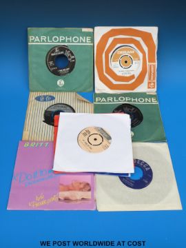 Four boxes containing approximately 600x 7" singles and EPs. The large majority are pop records from the mid-1950s to the early 1980s, the collection includes many records on the London American label and there are several collectable items. Artists include: David Bowie; The Rolling Stones; The Beatles; The Everly Brothers; Elvis Presley; The Yardbirds; Buddy Holly & The Crickets; Manfred Mann; Simon Dupree etc. There is some variability in the condition of the vinyl but the large majority appears to very good or better.