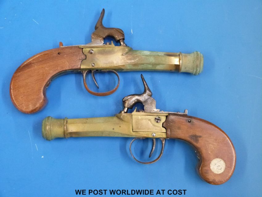 A pair of brass barrelled 12mm percussion pistols, the barrels with cannon type ends with octagonal shafts, overall length 17cm