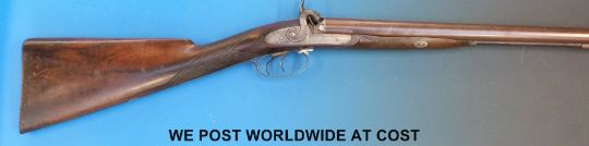 Westley & Richards 12 bore side by side muzzle loading hammer action gun with double trigger, chequered grip and forend and 29.5" Damascus barrels. C1850, overall length 118cm