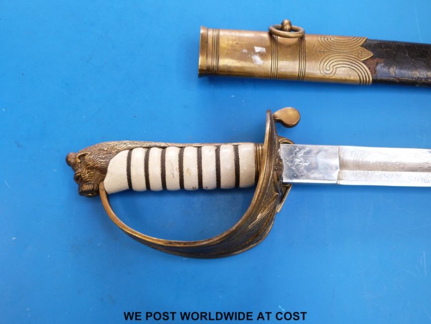 A replica 1827 pattern naval officer's sword in brass and leather sheath, the Wilkinson style etched blade decorated with fouled anchor and 'by warrant' near the hilt.