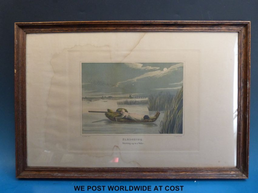 Henry Alken print 'Sledging Working up to a Wake', of a man duck shooting on the Norfolk broads.