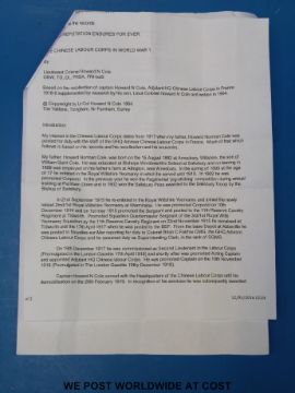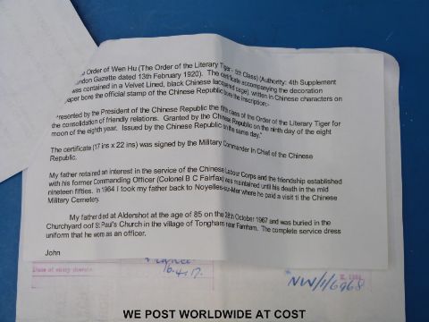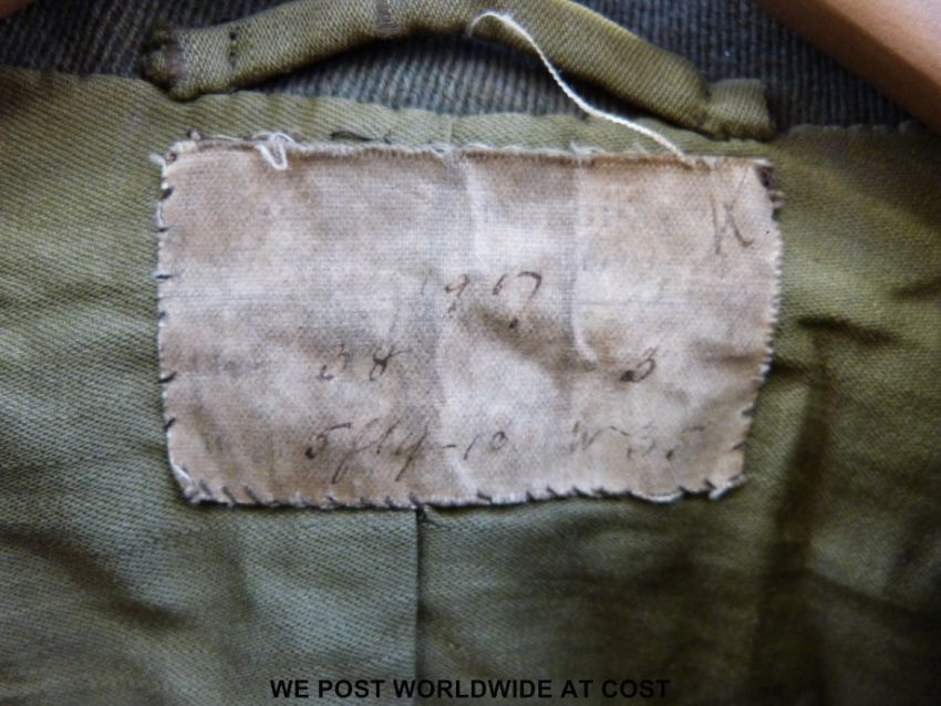 British Army officer's tunic, with brass Wiltshire Yeomanry buttons and officer's collar badges, medal ribbons and overseas service stripes. Ribbons are for British War Medal, Victory Medal, Territorial Force War Medal, Order of the Striped Tiger (China). Faded label but "1917" is clear, approx. 35-36 inch chest, rank insignia for Lieutenant on shoulders (2 pips have been removed). The tunic belonged to Captain Howard Norman Cole, who was SQMS with the Wiltshire Yeomanry and commissioned in the Labour Corps. He went on to serve as Adjutant of the Chinese Labour Corps, hence award of the Striped Tiger