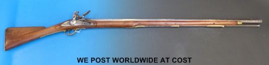 An India Pattern 'Brown Bess' .75 flintlock musket with brass trigger guard and butt plate, stamped to the lock with tower and crown over GR. 39" barrel, overall length 140cm
