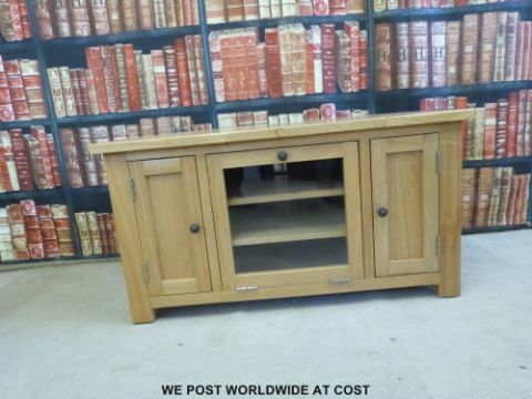 A modern light oak television stand with glazed fall flap door (W110 x H59cm)