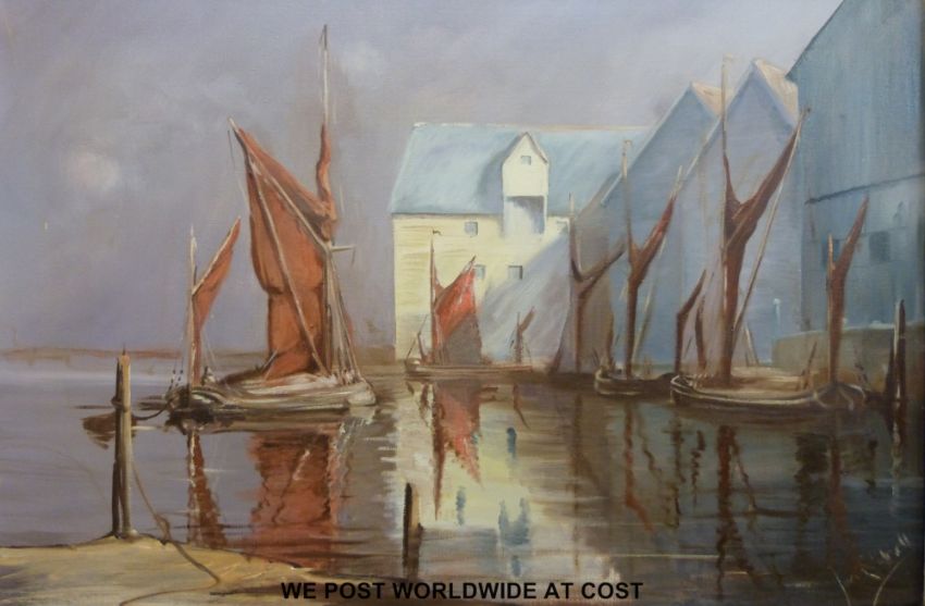 Oil on canvas sailing barges beside warehouses, indistinctly signed possibly John Sidney lower right (49 x 74cm)