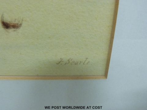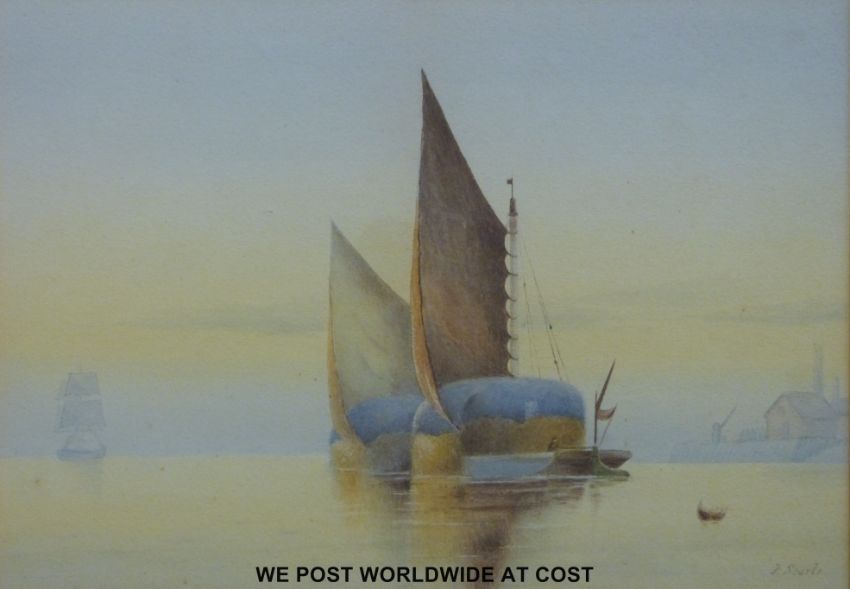 F Searle watercolour of shipping signed lower right (24 x 34cm) together with a watercolour of a fisherman beside river by the same artist (22 x 35cm)