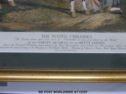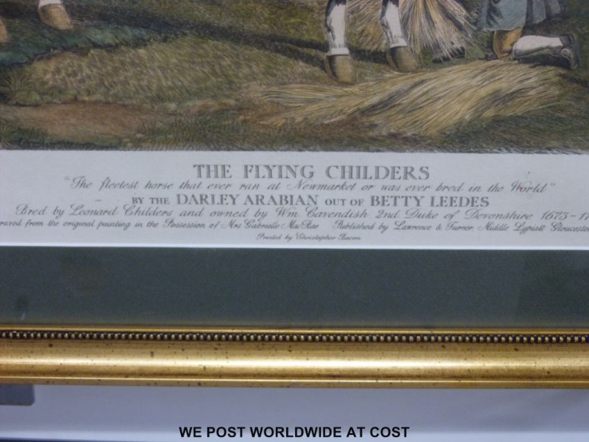 A coloured engraving of horse racing interest "The Flying Childers" after the original by John Wootton engraved by Stanley Reece and signed by Lord Devonshire lower right