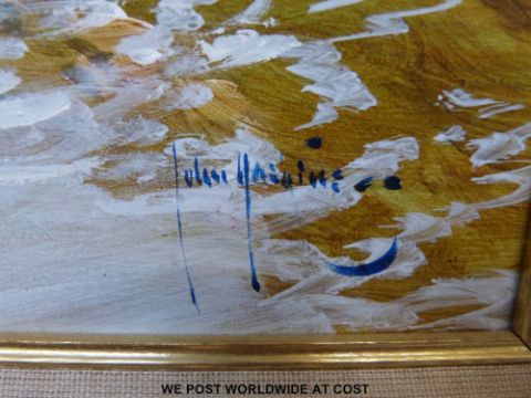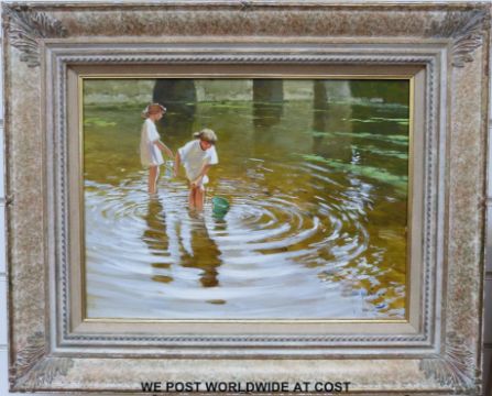 John Haskins oil on board children in stream with 1995 receipt verso (29 x 39cm)