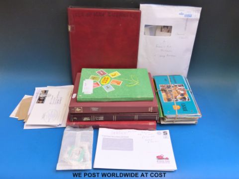 A box of Channel Islands and Isle of Man stamps including presentation packs, stock books, and loose stamps
