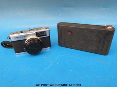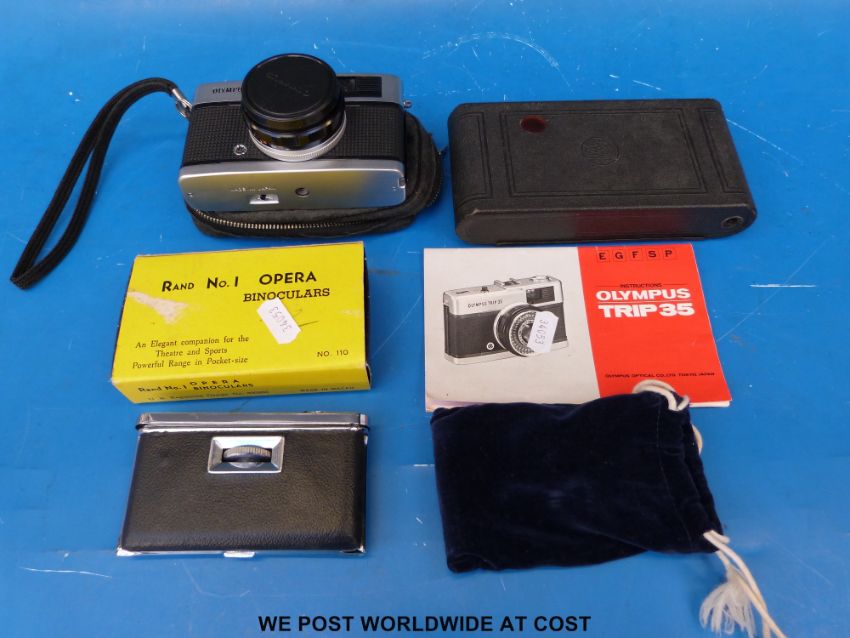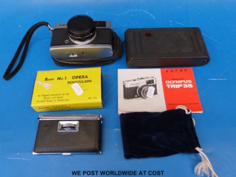 A pair of Rand No.1 Opera binoculars together with an Olympus Trip 35 camera and Kodak folding camera