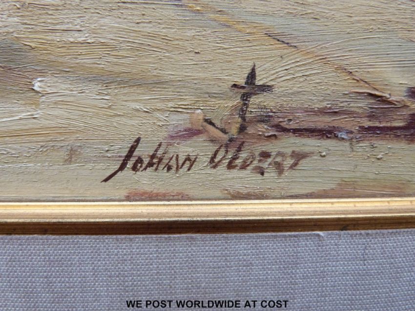 Johan Oldert (South African 1912-1984) oil on canvas beach with boats, sea and mountains beyond, signed lower right (38 x 53cm)