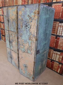 A set of vintage metal lockers comprising six small and one large lockable compartments, of haberdashery / shop fitting interest (W105 x D53 x H147cm)