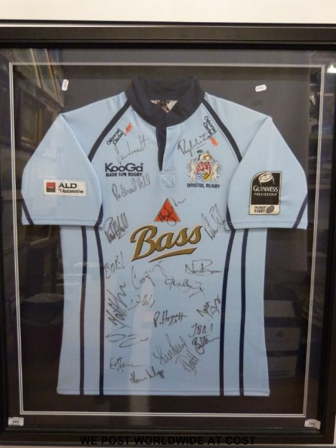 An autographed Bristol Rugby shirt signed by 20 players, framed and glazed.