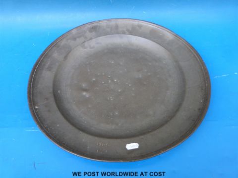 A large 19thC pewter charger initialled GTM (diameter 49cm)