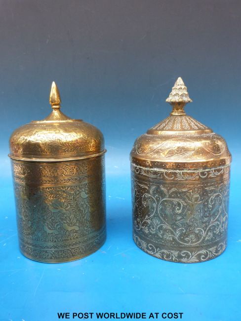 Two late 19th/20thC engraved brass lidded caddies of Indian or Persian origin (21cm tall)