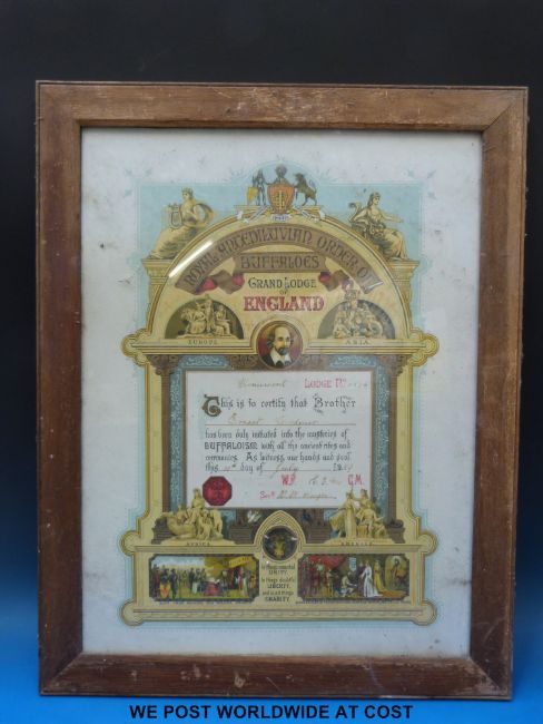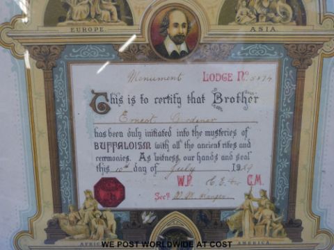A framed Royal Antediluvian Order of Buffaloes certificate relating to Ernest Gardiner of Hawkesbury Upton