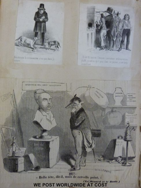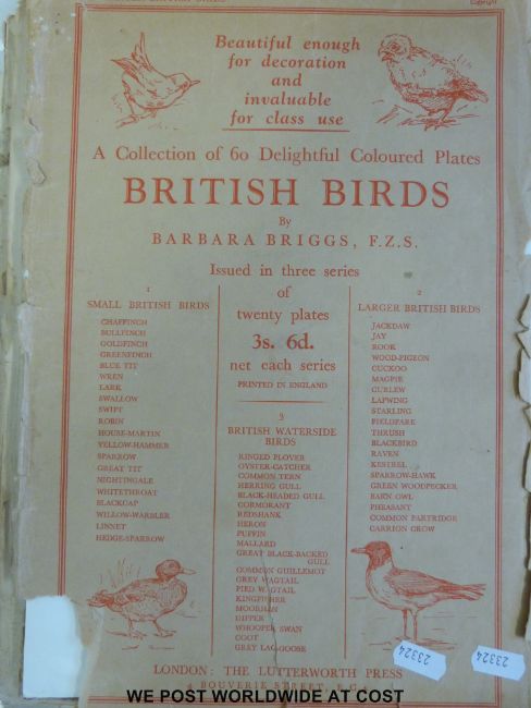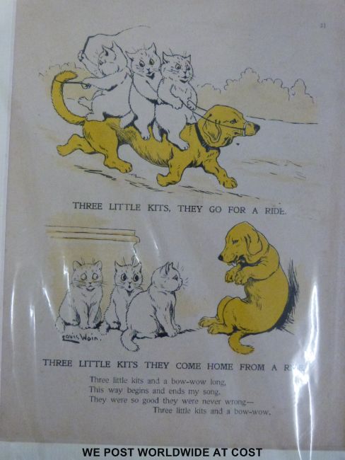 Six prints by Sir William Russell Flint, together with a print by Louis Wain, a collection of British Birds colour plates by Barbara Briggs, a small collection of French satirical pictures, some coloured, late 19thC, a watercolour signed P Jeannotte (1976) and five cloth-backed engravings about the death of Caesar and other Roman scenes etc