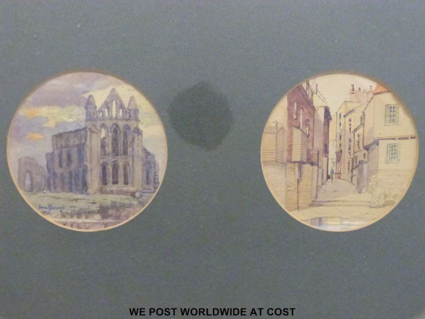 A small oil painting of a lady and child in front of a church at Stratford-upon-Avon signed E.B. Rowland together with two other framed pairs of pictures