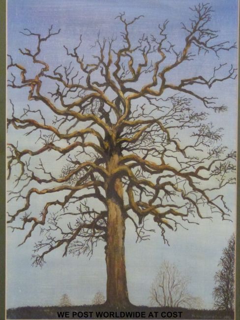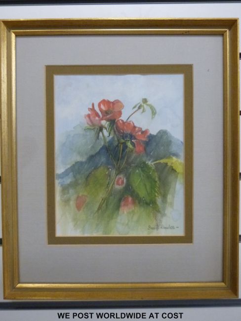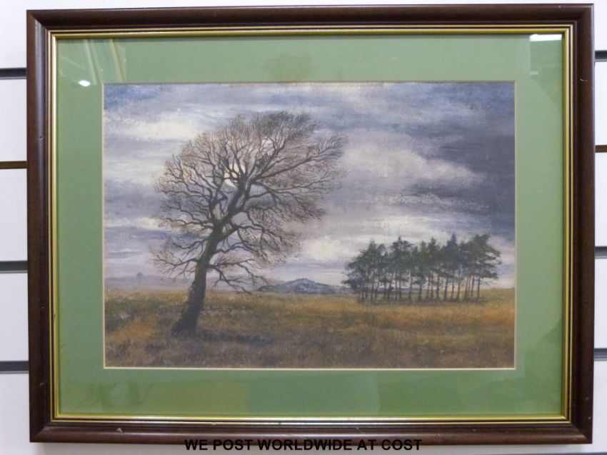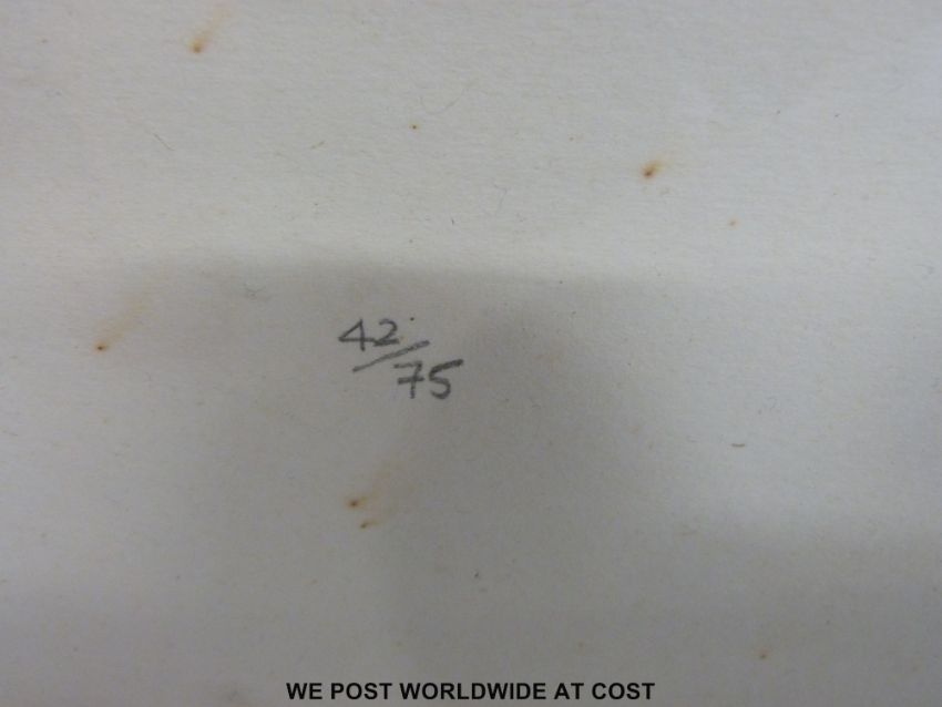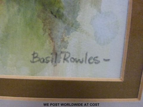 J. Kimpton oil on board of stoneware jars on a bench, together with prints by the same artist, a Basil Rowles watercolour and John G. Rigsby limited edition (42/75) 'Woodblock Hillside'
