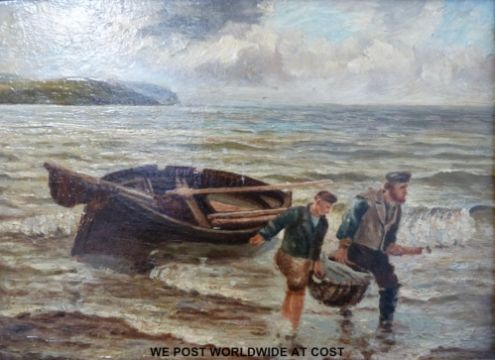 Colin Hunter (1841-1904) oil on canvas of a fisherman and a boy carrying a basket of fish from their rowing boat on the beach, inscribed Colin Hunter to rear of frame (22 x 30cm)