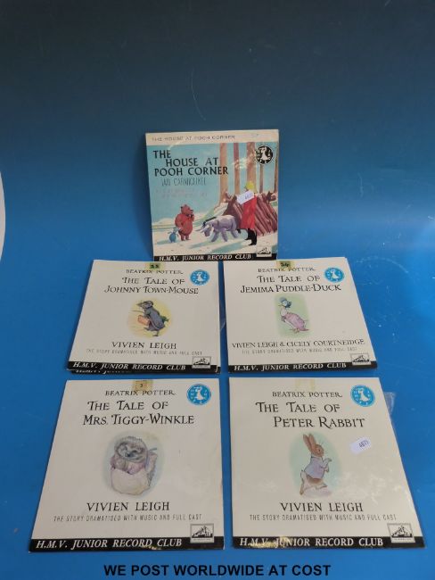 Eight 7" 45 rpm records of Vivien Leigh reading The tales of Peter Rabbit, Mrs Tiggy-Winkle, The Flopsy Bunnies, Jemima Puddle-Duck, Squirrel Nutkin, Benjamin Bunny and Johnny Town Mouse, together with Jan Carmichael reading The House at Pooh Corner.