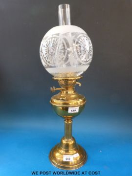 A brass oil lamp with etched globe type shade