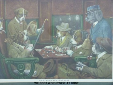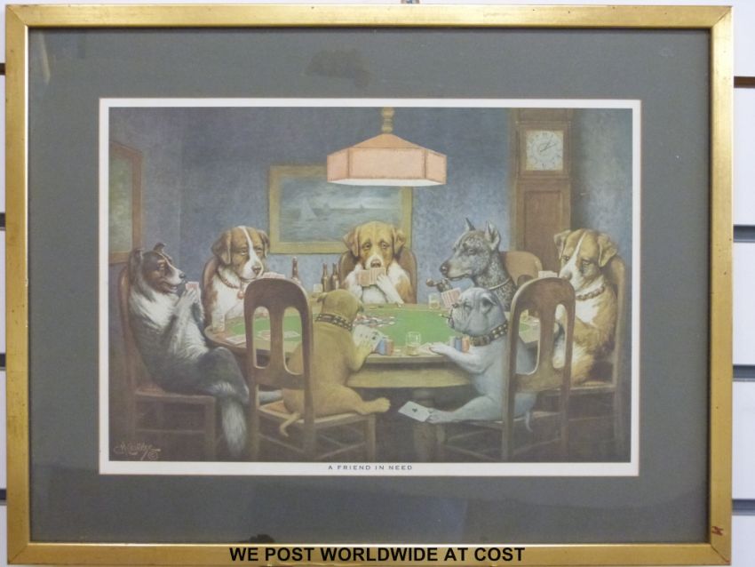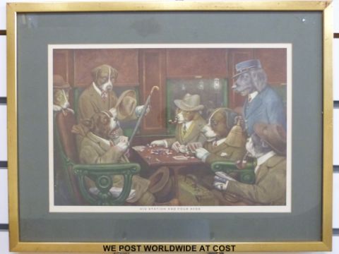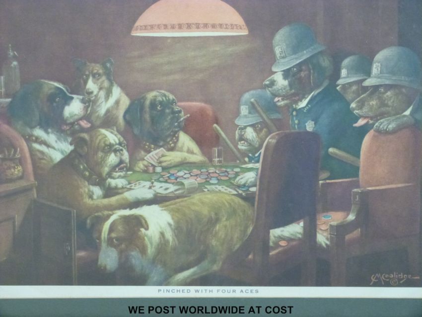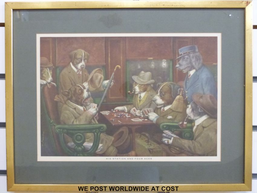 Five framed and glazed humorous dog prints relating to card games (each 25 x 36cm)