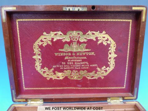 A large Victorian Winsor & Newton drawing/painting set, including large ceramic mixing pan, drawing pencils, brush rests, paints, cut glass bowl (width 30.5cm) etc