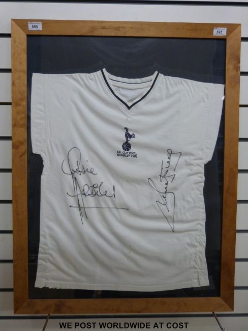 Autographed Tottenham Hotspur football club 1981 cup final football shirt signed by Ossie Ardiles and Ricky Villa, framed and glazed.