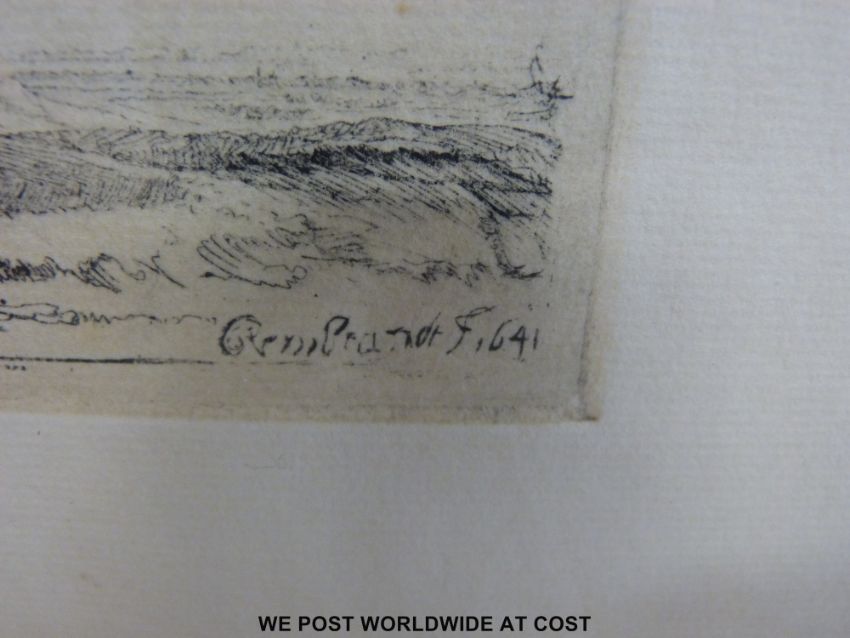 Rembrandt Van Rijn dry point etching of a windmill and buildings dated 1641 (15 x 21cm). Pencil script bottom left margin.