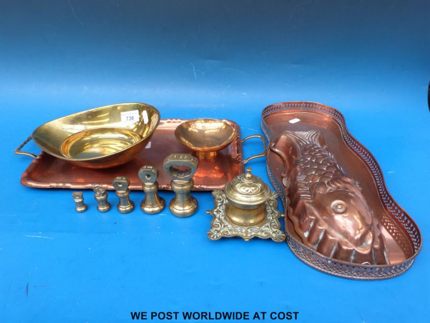 A collection of brass and copper items to include two copper trays, copper fish mould, brass ink well, run of weights etc